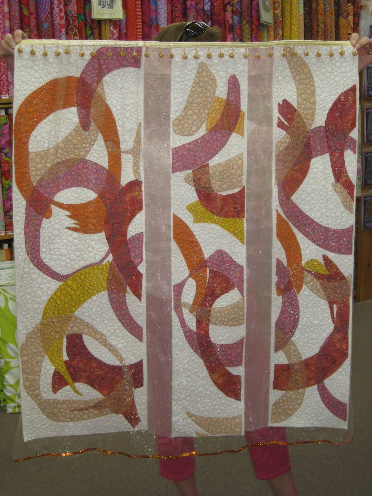 The purple tablerunner is Dottie Long's. The newsprint fabric bag was made by Shari.